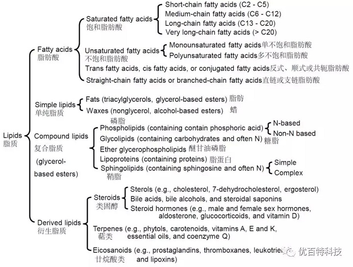 首先要從脂質(zhì)說(shuō)起。脂質(zhì)又稱為脂類,是一類不溶于水(一些小分子物質(zhì)除外)而溶于有機(jī)溶劑(如氯仿和乙醇)的碳?xì)浠衔铩8鶕?jù)Dr. Guoyao Wu 編著的《Principles of Animal Nutrition》中定義[1],脂質(zhì)可以分為脂肪酸、單純脂質(zhì)、復(fù)合脂質(zhì)和衍生脂質(zhì)(見(jiàn)下圖)。