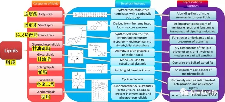 在脂質(zhì)組學(xué)(lipidomics)檢測(cè)中,可將脂質(zhì)分為脂肪酸(Fatty acids)、甘油脂(Glycerolipids)、甘油磷脂(glycerophospholipids)、鞘脂(Sphingolipids)、固醇脂(Sterol lipids)、異戊烯醇脂(Prenol lipids)、糖脂(Saccharolipids)和多聚乙烯(Polyketides)(見(jiàn)下圖)。